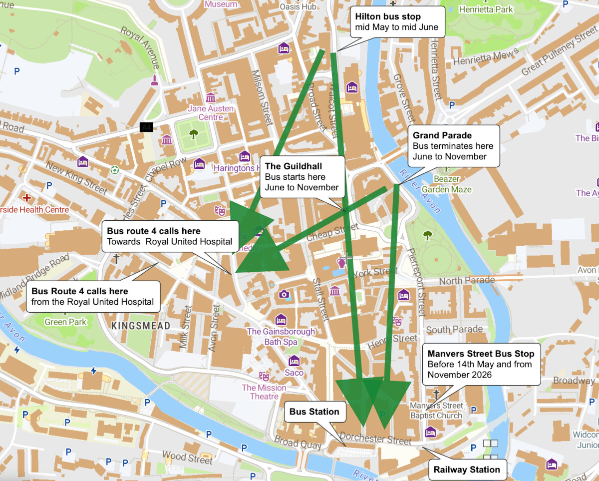 Onward connections to the Royal United Hospital may also be made at Westgate Buildings - a somewhat shorter walk, to bus routes including the 4 to the Royal United Hospital and the x39 to Bristol.